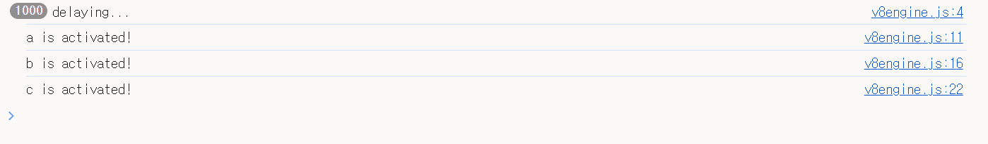 이벤트 루프는 비동기 함수를 태스크 큐로 보내고 콜스택이 비워지면 태스크큐에서 콜스택으로 이동한다고 한다. 콜스택에 먼저 스택이된 함수부터 실행이 되고 그 이후에 비동기 함수들이 실행된다는 뜻이다. 함수 실행순서를 1. 비동기 함수 2. 일반 함수 3. 일반 함수 로 실행해도 2->3->1 순으로 실행이 된다. // 지연시키는 함수 function delay(n){ for (let i = 0; i < n; i++) { console.log('delaying...'); } } // 콜스택 함수(일반함수) function a() { delay(1000) console.log('a is activated!'); } // 콜스택 함수(일반함수) function b() { console.log('b is acti..
